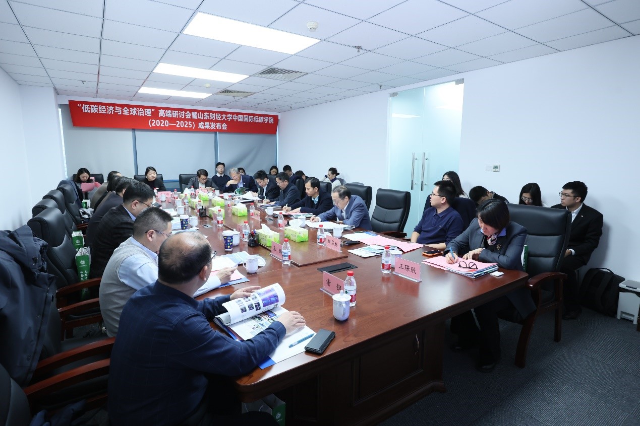 12月5日,“低碳经济与全球治理”高端研讨会暨山东财经大学中国国际低碳学院(2020-2025)成果发布会在山东财经大学北京研究院成功举行。对外经济贸易大学校长赵忠秀、山东财经大学党委副书记谢申祥、中国电子节能技术协会理事长黄建忠出席会议并致辞。国家发展和改革委员会能源研究所原所长、中国能源研究会能源经济专委会主任戴彦德,山东省生态环境厅气候处副处长王瑶,中国电子节能技术协会执行秘书长李鹏,中国社会科学院生态文明研究所副所长庄贵阳,清华大学地球系统科学系教授关大博,西北大学碳中和学院负责人谢钢,中国工业经济联合会中国工业碳达峰项目组组长、“一带一路”工商协会联盟副秘书长刘成林,可持续发展经济导刊社长于志宏,信发集团副总经理张怀涛,山东发展集团总经理助理、绿色投资集团党委书记、董事长朱鹏,邦得国际供应链总经理兼财务总监李东穗,绿色创新发展研究院(iGDP)分析师刘晶宁等出席会议。中国国际低碳学院执行院长王璟珉主持会议。
