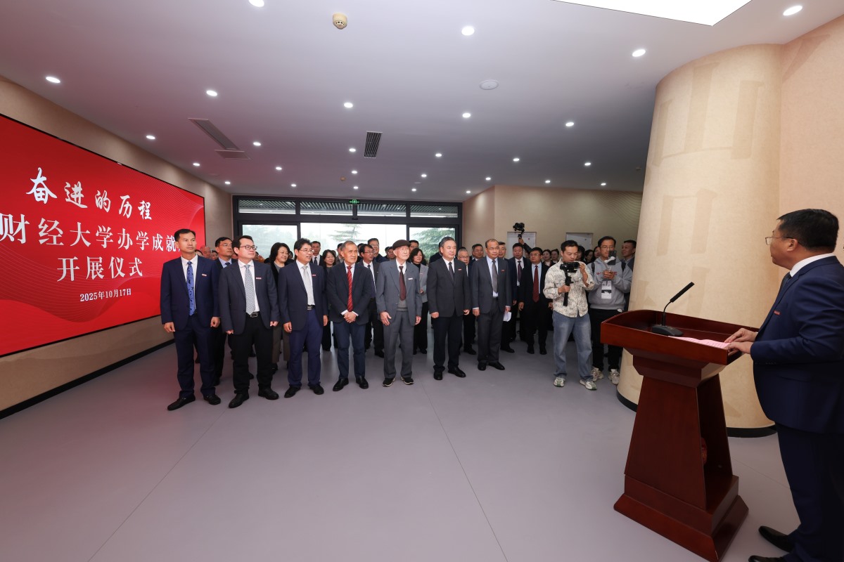 据悉,根据学校的工作部署,办学成就展筹备工作自去年7月启动,专门成立了工作领导小组以及工作专班,分工负责文稿内容撰写、版式设计等,合力推进布展。成就展总面积近700平方米,共分为“筚路蓝缕 以启山林”“一脉同行 蓬勃发展”“相与为一 踵事增华”“砥砺奋进 未来可期”等四个篇章,集中展示了照片400余张,图表50余幅,报刊、论坛文章报道40篇,多媒体互动10余处,历史文件、证书、资料、书法、文创产品等实物100余件,较为全面地展示了学校建校至今创建、变迁、合并、融合的发展历程和在学科建设、人才培养、科学研究、社会服务、国际交流合作、文化传承创新等方面取得的办学成就,旨在激发全校师生立足新起点、再创新辉煌的信心和干劲,续写全面建设新时代高水平财经大学新篇章。