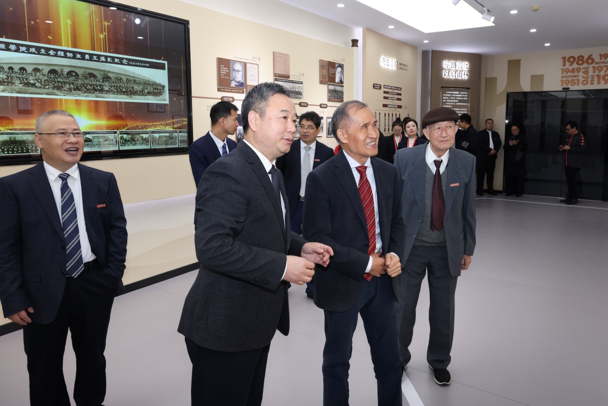 在热烈的掌声下,查玉喜、洪俊杰、张体勤、姜宗俊共同为办学成就展揭幕,并与校友代表合影留念。